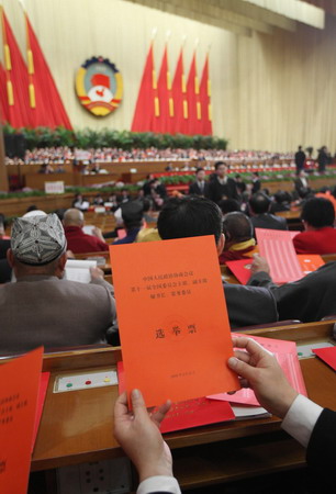 (Xinhua) Updated: 2008-03-13 20:14 ![]() A members of the Chinese People's Political Consultative Conference (CPPCC) reads his ballot to elect the new leadership of the CPPCC during the fourth plenary meeting at the Great Hall of the People in Beijing March 13, 2008. Jia Qinglin was reelected chairman of the National Committee of the CPPCC. [Xinhua]
