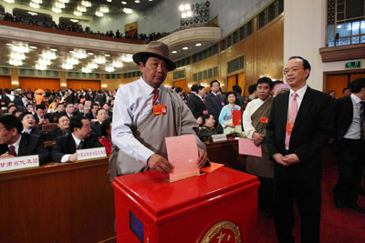 A Tibetan deputy to the National People's Congress casts his ballots to elect state and legislature leaders in the Great Hall of the People's in Beijiing March 15, 2008. Wu Bangguo was reelected NPC Standing Committee chairman. [Xinhua]