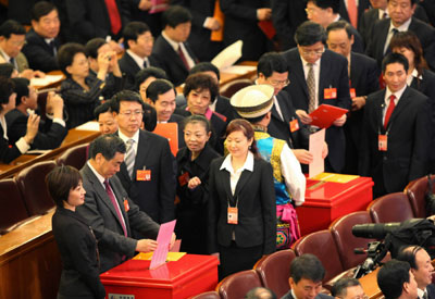 Deputies to the National People's Congress cast their ballots to elect state and legislature leaders in the Great Hall of the People's in Beijiing March 15, 2008. [Xinhua]