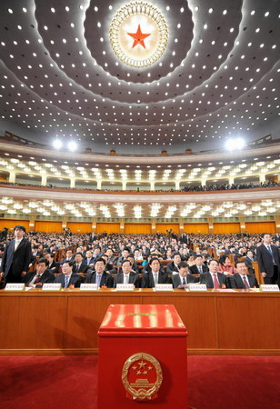The sixth plenary meeting of the First Session of the 11th National People's Congress (NPC) is held at the Great Hall of the People in Beijing, March 16, 2008. [Xinhua]