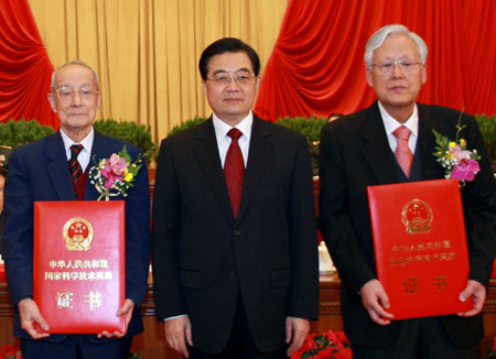 Updated: 2009-01-10 07:44 Neurologist Wang Zhongcheng and chemist Xu Guangxian were presented with the country's top award for scientific and technological innovation on Friday at the Great Hall of the People in Beijing. They will each receive 5 million yuan ($730,000). President Hu Jintao presented the scientists with their certificates. Premier Wen Jiabao made a keynote speech at the event.