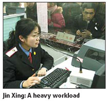 Updated: 2009-01-20 07:42 Jin Xing leaves home for work before 7 am every day and never finishes before 11 pm. A break of 15 minutes for lunch is the only one she gets. She spends the rest of the time in front of a computer, limiting her sips from her teacup because she cannot afford to go to the toilet too often and make her customers wait. Jin counts the number of questions she has for the customers, too. And the question she always puts to the 1,000-odd customers she deals with daily is: "Where would you like to go?" Jin, 30, is one of the 373 employees manning ticket counters at Beijing Railway Station. She has been clocking almost 16-hour shifts a day since Christmas and shouldering a workload more fitting for a robot. All this is part of the Ministry of Railways' efforts to meet the Spring Festival travel rush, from Jan 11 to Feb 19. The station, already one of the busiest in the country in normal times, has reportedly opened thrice the usual number of ticket counters and extended its working hours to deal with the travel rush. "I just can't leave my seat every one at the station is busy now," Jin told China Daily yesterday. Her voice was hoarse from talking to hundreds of people a day for the past few weeks. "During the travel rush, almost every station employee works under inhuman conditions," said Wang Meng, director of the station's ticket department. As if her workload was not enough, Jin was once fined 145 yuan ($21), the money a customer did not pay for a ticket he slipped off with when she was distracted by three other people. "More than 130,000 passengers are taking trains from the station every day now. But Thursday will see the real rush with more than 180,000 departing from the station," said Cai Yanmei, a Beijing Railway Station press official. The number of people boarding and alighting trains at the station is more than 300,000 a day during the peak travel period, Cai said. Railway officials said 188 million people are expected to take trains between Jan 11 and Feb 19 across the country, and though they try their best, it is not possible to satisfy everyone. |