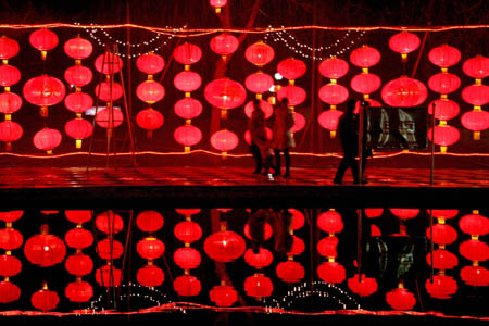 People enjoy the red lantern wall along a street in Yongji, north China's Shanxi Province, February 2, 2009. Various lanterns are hung up for the coming Chinese Lantern Festival, which falls on February 9 this year. [Xinhua]