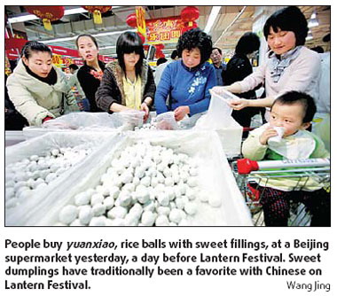 Updated: 2009-02-09 07:30 Tonight the moon is supposed to look the biggest and brightest in all of 52 Lantern Festivals. It may not be good news for some people because they believe full moons could affect human behavior and cause accidents. But yuanxiao retailers are not complaining. After all, it means good business for them.