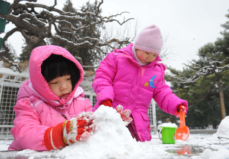 Two kids play with snow at Zhongshan Park in Beijing on February 18, 2009. The first snow this year began to fall on China's capital city Beijing in the wee hours of Tuesday, bringing with it joy to the city that had endured a long dry period. [Xinhua]