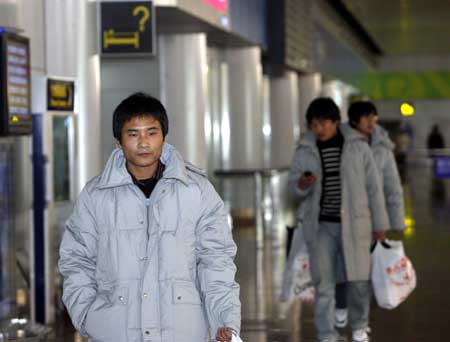 Song Jin (L ), a crew member of the sunken cargo ship the New Star, arrives at the Beijing Capital International Airport, February 25, 2009. [Xinhua]