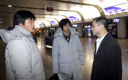 Crew members of the sunken cargo ship the New Star talk with an official with the Foreign Ministry of China at the Beijing Capital International Airport, February 25, 2009. [Xinhua]