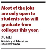 They will work under three-year contracts with local education departments and be paid by a special central government fund, the Ministry of Education said. "Most of the jobs are only open to students who will graduate from colleges this year," ministry spokeswoman Xu Mei said on Wednesday. "But some teaching positions are open to outstanding degree holders who graduated in past years, such as those who have volunteer teaching experience in rural schools," she said. The short-term teacher project was launched in 2006 to help college graduates find employment. The teachers will work at primary and high schools, mostly in rural areas. Besides salary from the central government, they may get bonuses and subsidies from local governments, Xu said. After the three-year contract expires, schools will decide whether to renew the contracts. The teachers will be recruited through public job fairs.
