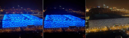 A combination picture shows China's National Aquatics Center, also known as Water Cube, in Beijng before and after the lights were turned off for Earth Hour March 28, 2009. [Xinhua]