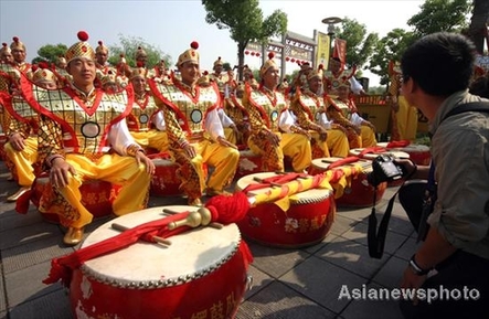 People perform folk dancing in Jiaxing, Zhejiang province, Wednesday, to mark the Dragon Boat Festival, which is celebrated across China Thursday. [Asianewsphoto]