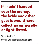 "I was on a business trip when my friend got married and could not attend, but I still had to prepare an envelope and ask someone who was going to present it. There is no escape," said Sun Meng, a 30-year-old office worker from Chengdu, capital city of Sichuan province.