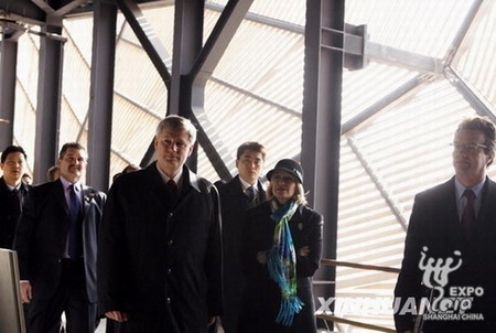 Canadian Prime Minister Stephen Harper (front, L) visits the Canada Pavilion for Expo 2010 in Shanghai December 5, 2009. [Xinhua]