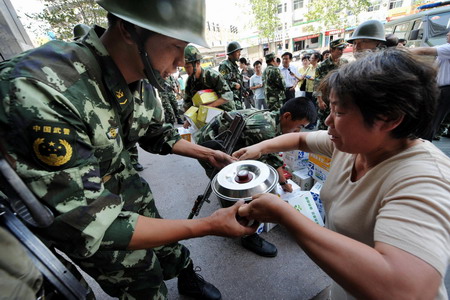 Updated: 2009-07-11 00:47 A woman gives self-prepared porridge to the public security forces whose intrepid presence spared the riot-plagued city from further unrests, in Urumqi, northwest China's Xinjiang Uygur Autonomous Region, Friday July 10, 2009. [Xinhua] |