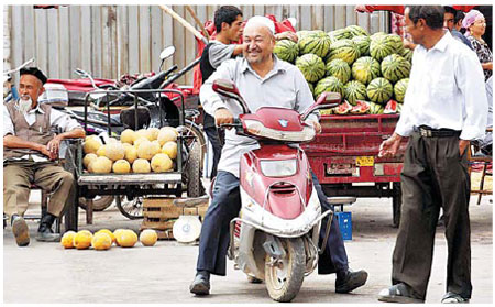 A Uygur farmer brings a truck-load of watermelons to sell at a bazaar in Kuche county, Xinjiang, July 10, 2009. [Xinhua]