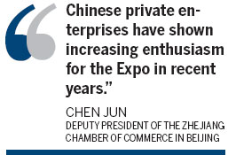 Chen Jun, deputy president of the Zhejiang Chamber of Commerce in Beijing, said: "Chinese private enterprises have shown increasing enthusiasm for the Expo in recent years. They believe the event will benefit their enterprises even in its aftermath."