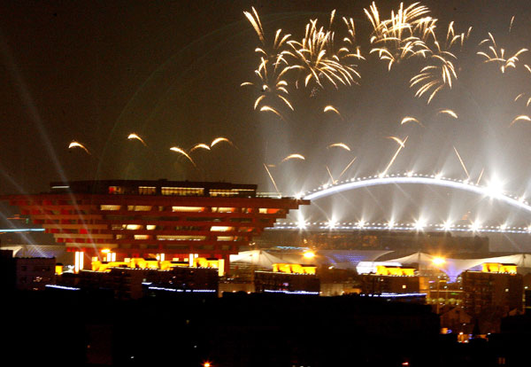 Spectacular fireworks explode over the Huangpu River during the opening ceremony for the 2010 World Expo held in Shanghai, east China, April 30, 2010. [Xinhua]