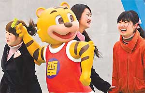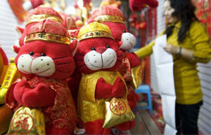 A vendor arranges tiger toys at a market in Urumqi, capital of Northwest China's Xinjiang Uygur Autonomous Region, Jan. 26, 2010.