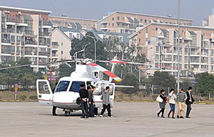 Zou Jianming lands his rented helicopter on a square in Fuzhou, capital of Fujian province after a three-hour flight from Shanghai on February 9, 2010.
