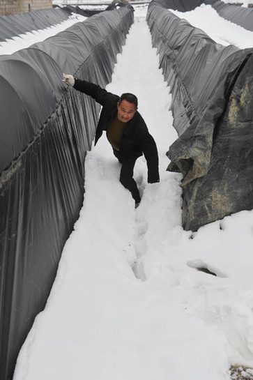 Zhang Yuanbiao, a farmer in Yuping county of Tongren, Guizhou province, walk in thick snow accumulated beside greenhouses for vegetables on Jan 22, 2011. Seven of Zhang's 16 greenhouses have collapsed due to heavy snowfall in the area. [Photo/Xinhua]