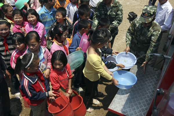 Firefighters help students get water from a truck on a school playground in Xihe township, Suizhou city, Central China's Hubei province, May 26, 2011. The drought has left 5,400 residents and two schools in Xihe short of drinking water. [Photo/Xinhua]