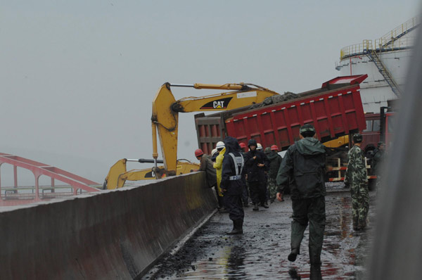 More than 1,000 firefighters, troops and border guards are battling to plug the breached dike at Fujia industrial chemical plant near Dalian, reports People’s Daily.
