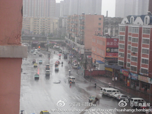 A street in Dalian, Liaoning province is flooded after heavy rain from Muifa. The picture was posted to the micro blog of Huangshang Morning Post on Weibo.
