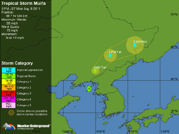 Muifa is now expected to make landfall along the coast of Liaoning on Monday night with tropical storm force winds powerful enough to bring down power lines and damage homes. Current computer models then show the storm tracking northward over the province of Jilin before dissipating further inland on Tuesday.