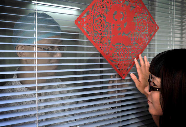 Ding Genxiu looks at her fiance Ke Peizong through the window of his isolation chamber in Fuzhou, Fujian province. Ke was diagnosed with acute lymphatic leukemia in September. Lin Lianghua / for China Daily |