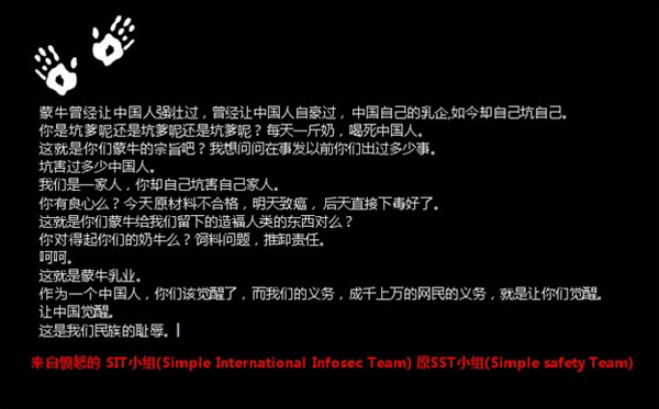 A screen grab of Mengniu's official website on Wednesday night. The website was hacked into at 11pm for about an hour. [Photo/21cbh.com] |