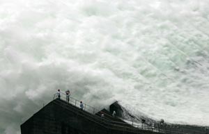 Water was discharged from Xin'an River Reservoir in West Zhejiang on Tuesday morning in a bid to release pressure on the dam that had been holding back the swollen waters of Qiantang River.
