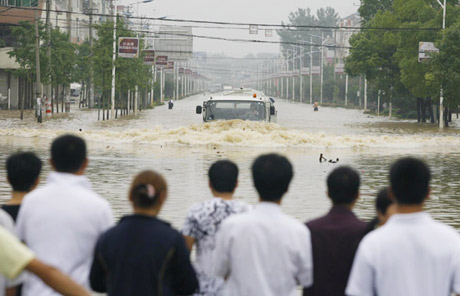 A bike rider wades through a flooded road in Nanjing, capital of East China Jiangsu province, June 18, 2011.
