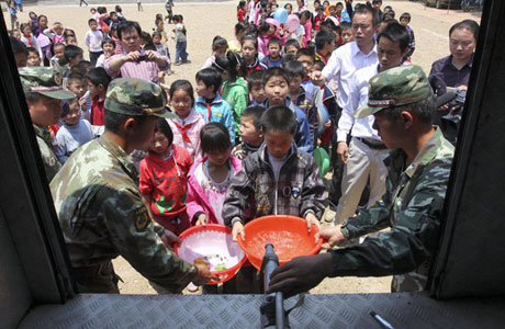 Students wait in lines to get water from a truck on a school playground in Xihe township, Suizhou city, Central China's Hubei province, May 26, 2011. The drought has left 5,400 residents and two schools in Xihe short of drinking water.