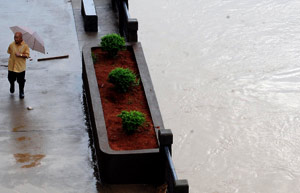 A woman carrying a load walks near the Minjing River, which threatens to flood a main road, in Shunchang county, Southeast China's Fujian province, June 8, 2011. Water in the river has passed the 117.5 meter warning level due to recent lingering rainstorms.