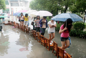 Hubei University students walk on a "bridge" of chairs over a flooded path on June 14, 2011.Heavy rain hit Wuhan and Hubei provinces causing flooding. Drainpipes broken by construction workers near Hubei university campus also added to the problem.