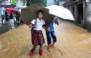 Two pupils hold hands as they walk on a flooded street outside their school gate in Huangshi, Hubei province, on June 14, 2011. Heavy rains caused flooding which trapped school students.