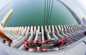 Workers clean the body of the Three Gorges Dam in Yichang, Central China's Hubei province, April 14, 2011.