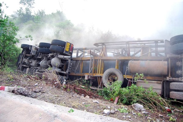 A tank vehicle loading 26 tons of hydrochloric acid rolled over in Nanxiong city in South China's Guangdong province on April 15, 2012. [Photo/CFP]