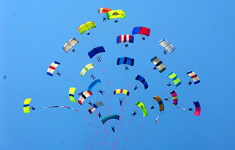 | Parachuters perform during the 4th China Anyang International Aero Sports Tourism Festival in Anyang, Henan province, May 26, 2012.[Photo/Xinhua] |