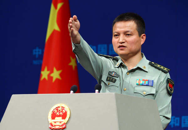 China’s Defense Ministry spokesman Yang Yujun answers questions at a regular news conference in Beijing on Thursday. He dismissed media reports saying that China is building a second aircraft carrier in Shanghai and that it will be unveiled by the end of the year. ZOU HONG / CHINA DAILY |