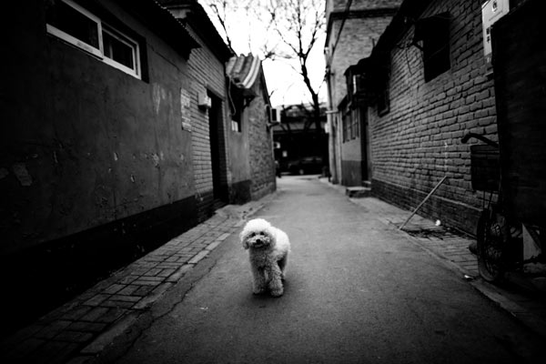 A dog runs through a lane in Shuangzhalan Hutong, or double-fenced hutong, in south Beijing on March 25, 2010. [Photo by An Lingjun / For China Daily]