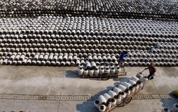 Workers check crocks of yellow rice wine in Shaoxing, East China's Zhejiang province, on Nov 7, 2012. [Photo/Xinhua]