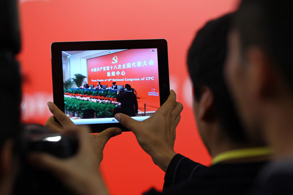 A journalist takes pictures with a tablet computer at a news conference by Zhang Ping, head of the National Development and Reform Commission, at the Party congress on Saturday in Beijing. Zou Hong / China Daily |