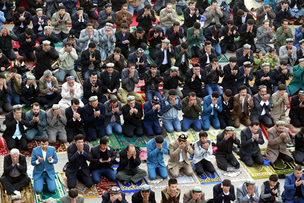 Muslims pray at the Id Kah Mosque in Kashgar, the Xinjiang Uygur autonomous region, on Tuesday, marking Eid-al-Adha, also known as Corban Festival by Uygurs. Photos by Feng Yongbin / China Daily |