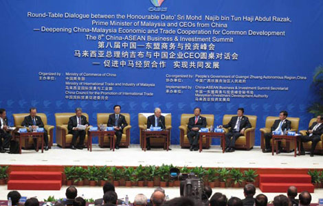 Malaysian Prime Minister Najib Tun Razak, Wan Jifei, Chairman of the China Council for the Promotion of International Trade, and Chinese Vice-minister of Commerce Gao Hucheng attend the roundtable dialogue in Nanning.