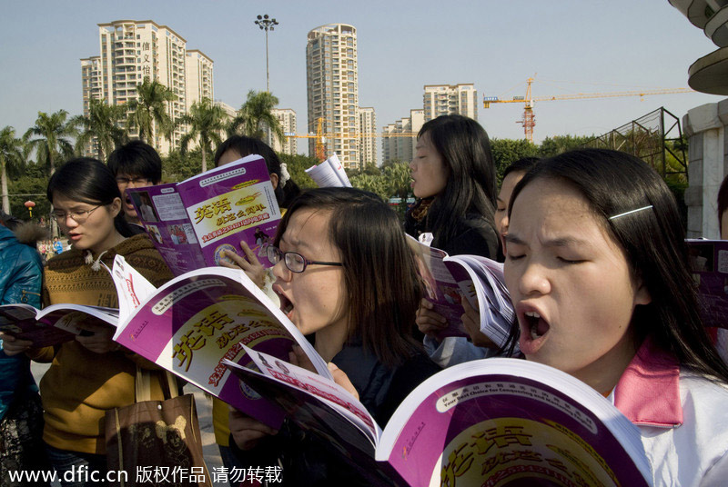 Female workers practice the speaking English in Chang'an town, Dongguan cit on Jan 1, 2011. [Photo/icpress.cn]