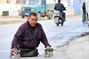 This picture shows Zhao Na who suffers from cerebral palsy since early childhood. She uses her feet to do housework and take care of her mother – who became paralyzed and lost her sight about six years ago. [Photo/icpress.cn]