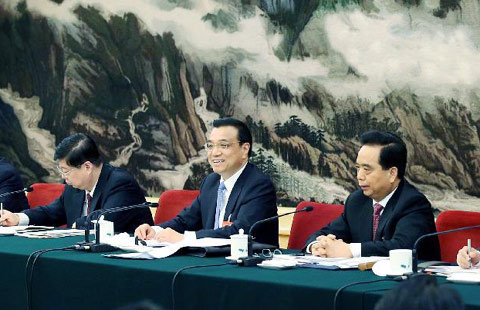 Chinese Premier Li Keqiang joins a discussion with deputies to the 12th National People's Congress (NPC) from northwest China's Qinghai Province during the second session of the 12th NPC, in Beijing, capital of China, March 6, 2014.
