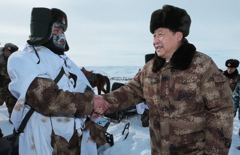 Chinese President Xi Jinping visits soldiers on Sanjiao Mountain in Arshaan city, Hinggan League, Inner Mongolia autonomous region, in temperatures of -30 C, on Jan 26, 2014.
