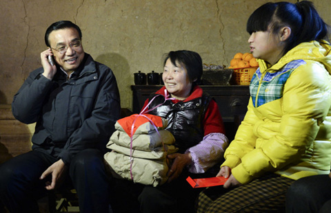 Premier Li Keqiang talks with the father of Yang Kang, a 12-year-old girl, over the phone during a visit to her home in Xunyang county,Shaanxi province, on Jan 27.