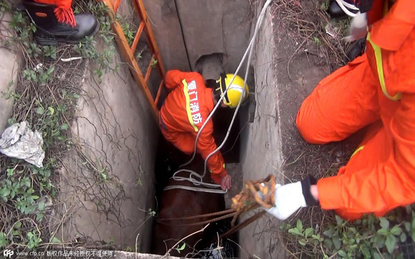 A firefighter goes into the well to tie ropes onto the creature. [Photo/CFP]